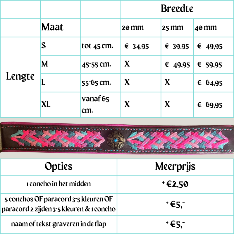 De halsband is helemaal naar wens te maken. Zo kies je zelf de kleur van het tuigleer, de kleur van de voering en, indien je voor paracord kiest de kleur van het paracord (5 kleuren totaal, bij kleinere banden 3 kleuren totaal). Ook kun je kiezen voor conchos (metalen versieringen) met een blauwe steen of zonder een blauwe steen in zilver- of bronskleur. Er zijn een beperkt aantal conchos met stenen in andere kleuren.