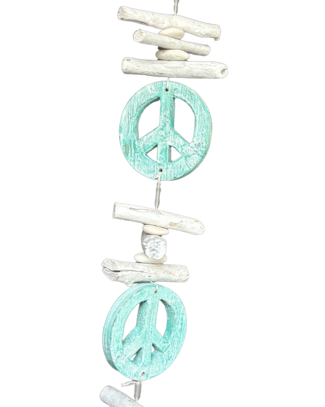 Breng een vleugje rust en harmonie in je interieur met deze prachtige handgemaakte wandhanger uit Bali. De combinatie van natuurlijke houten elementen en turquoise peace-tekens creëert een speelse en serene uitstraling. Perfect voor in de woonkamer, slaapkamer of tuin.