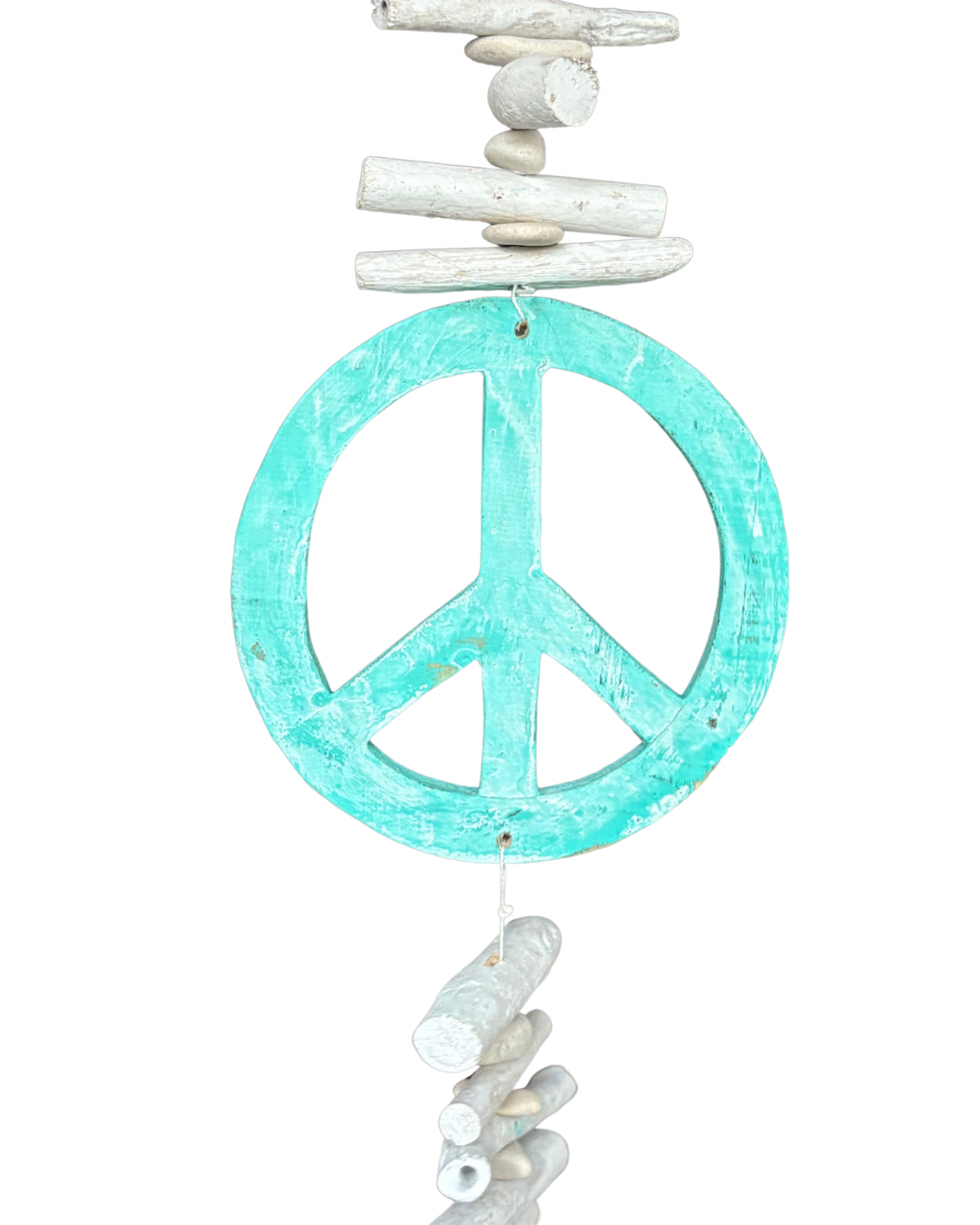 Laat je interieur stralen met deze prachtige handgemaakte wandhanger, waarin natuur en symboliek samenkomen. De royale peace-tekens in rustgevend turquoise worden afgewisseld met natuurlijk hout, wat zorgt voor een unieke, bohemian uitstraling. Een echte blikvanger voor je woonkamer, veranda of meditatiehoek!