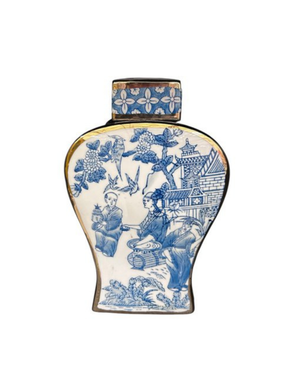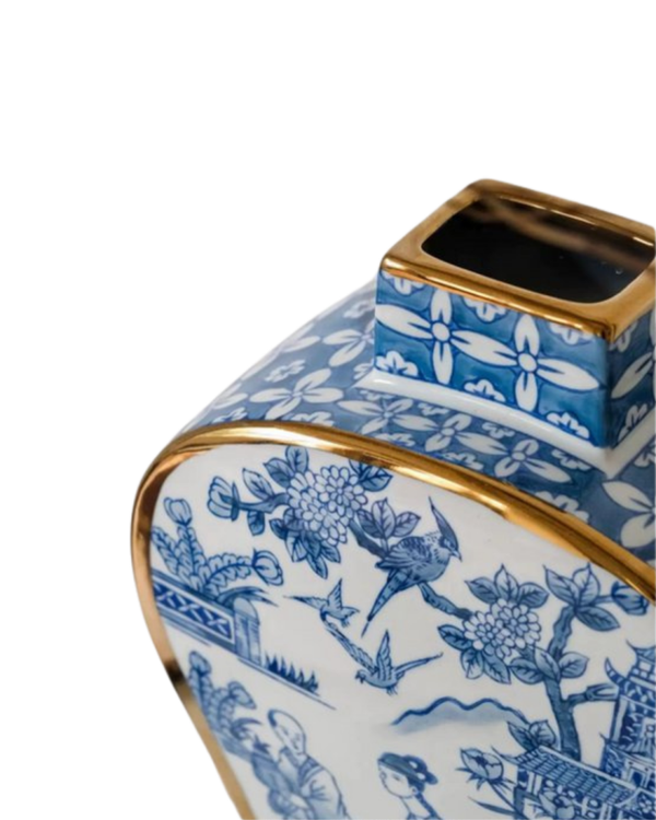 Blauw-witte porseleinen vaas met gouden accenten