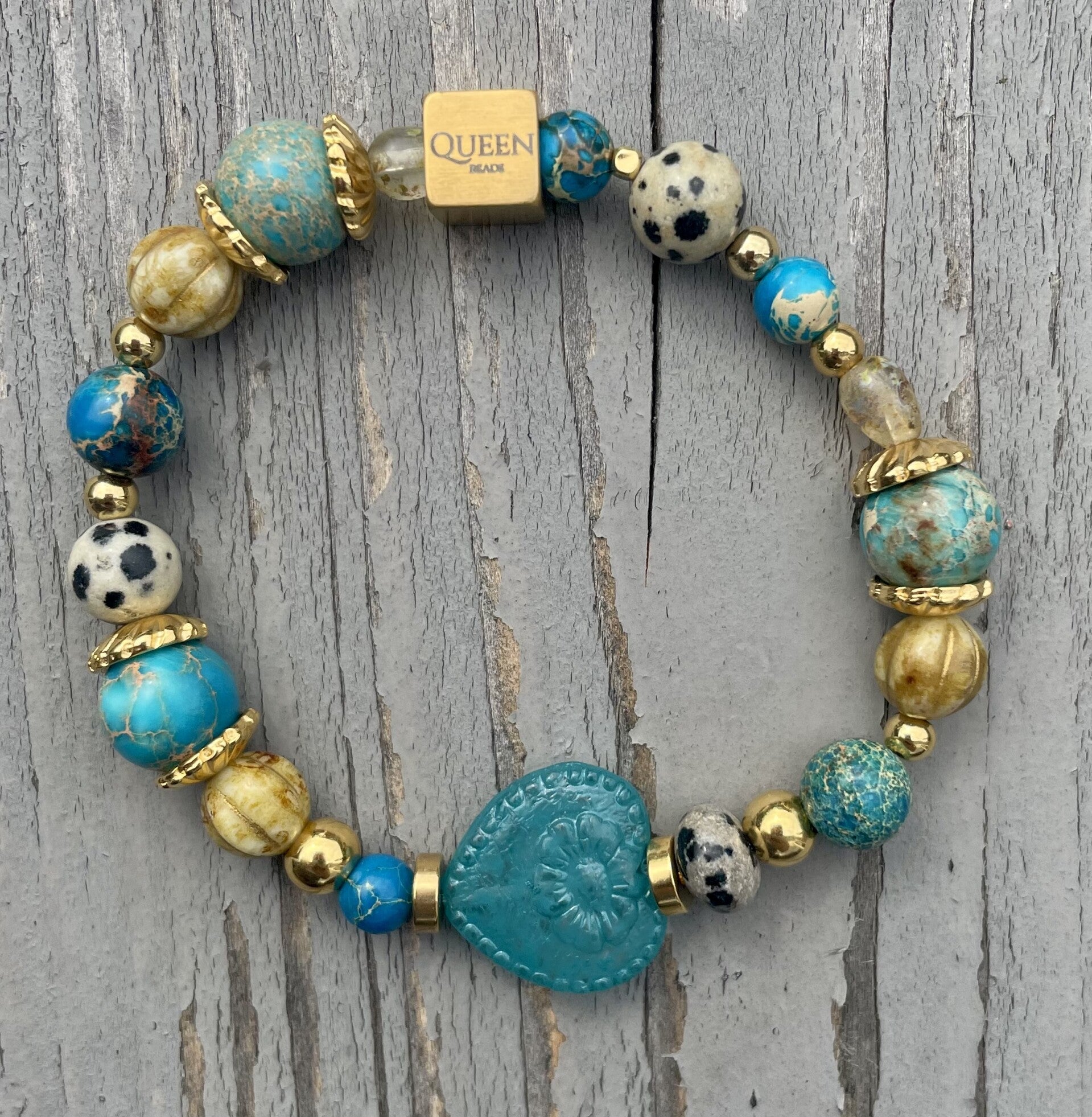 Deze armband is gemaakt van sediment, (dalmatiër) jaspis, Tsjechische glaskralen en DQ goud.