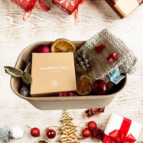 De giftbox zelf is gemaakt van falcata hout en gevuld met divers natuurlijk decoratiemateriaal en kerstballetjes.