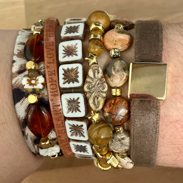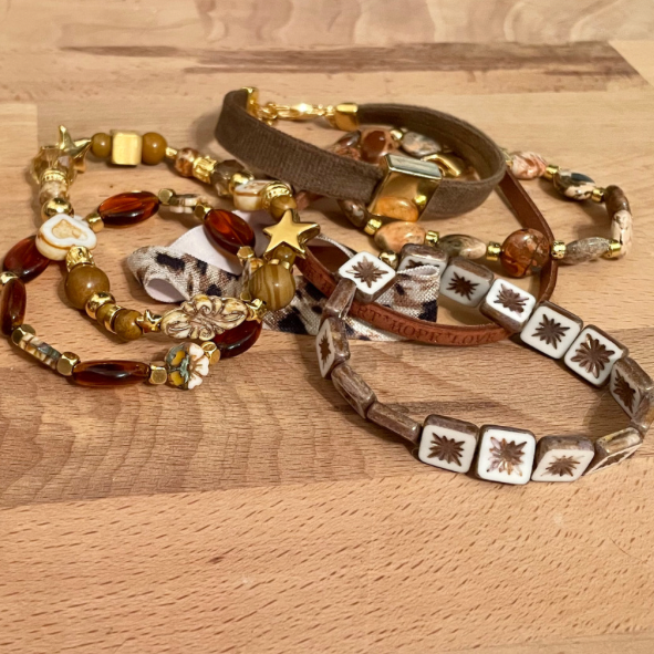 - Een armband van jaspis (versteend hout), Tsjechische glaskralen waaronder 2 harten en een sierlijk ornament, DQ gouden tussenkralen en een RVS goudkleurige Queen Beads kraal.
