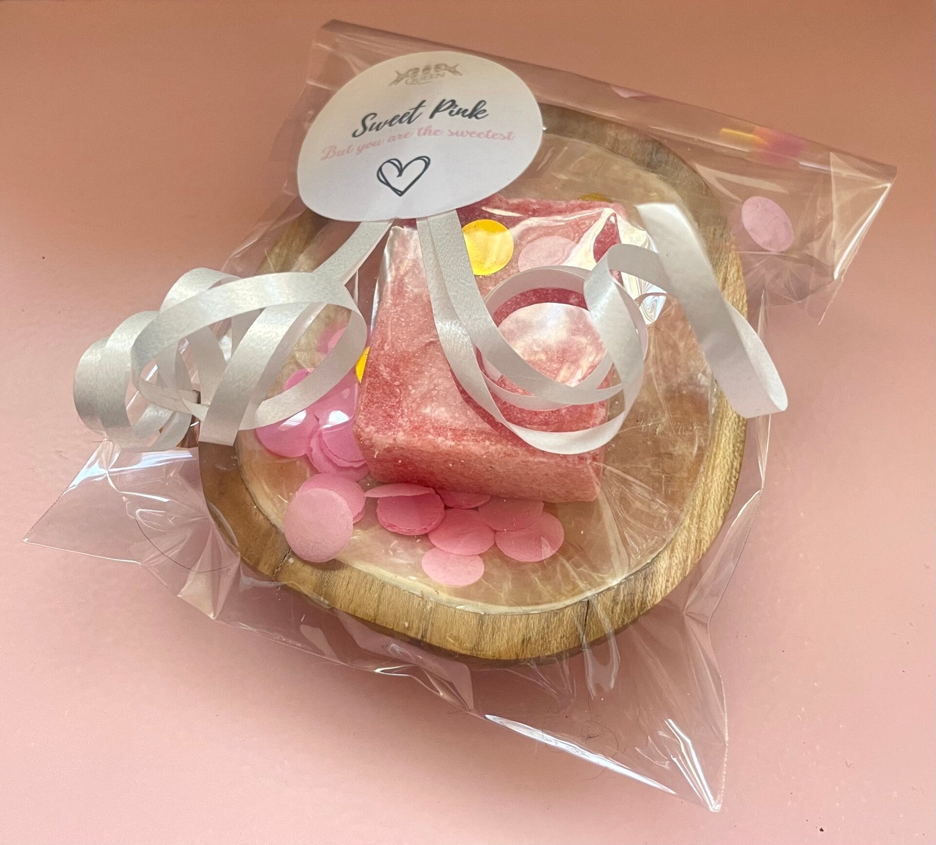 Natuurlijk leuk verpakt met roze en gouden confetti en een sticker met daarop de tekst: 'Sweet Pink - But you are the sweetest'.