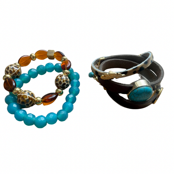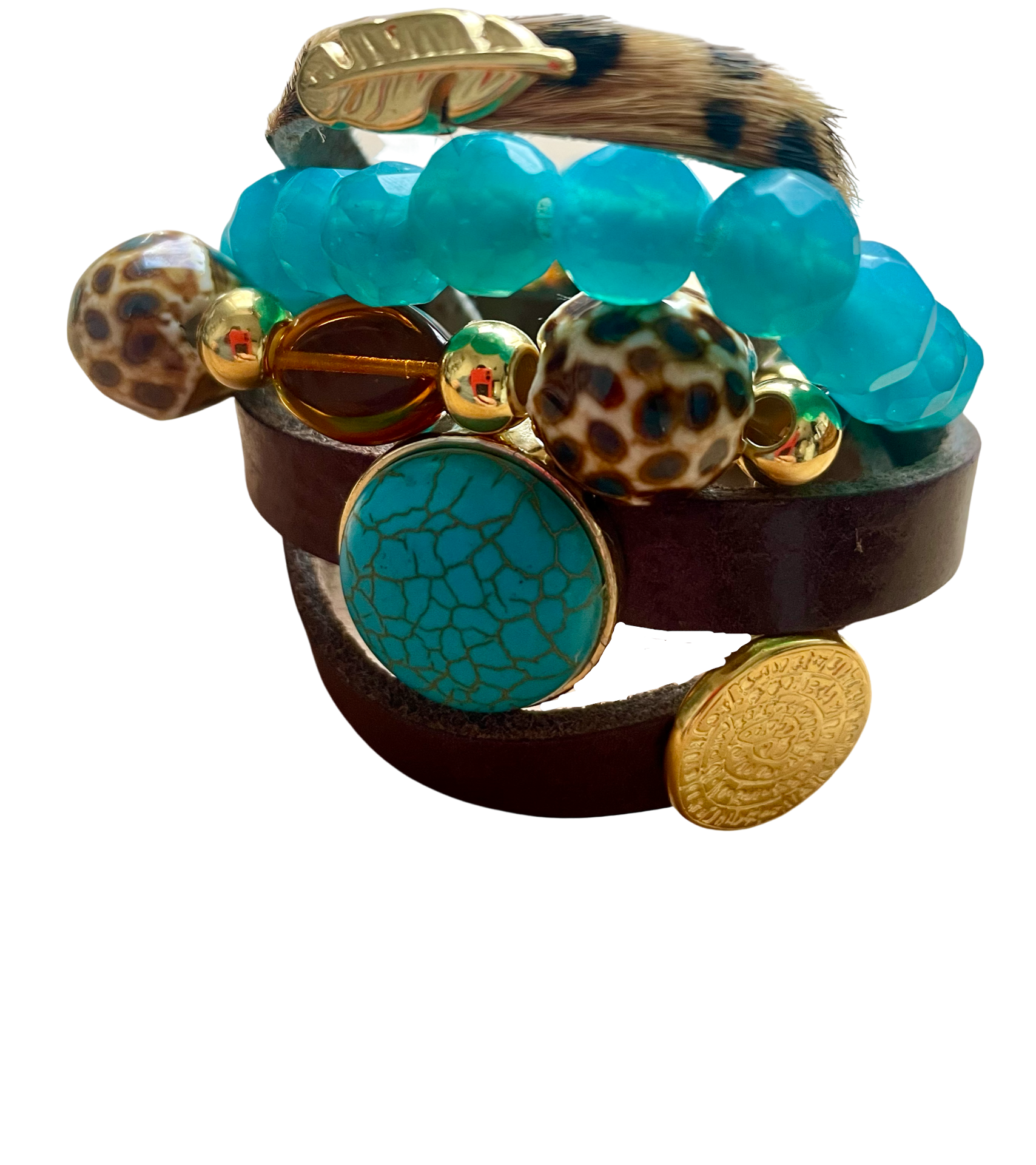 - Een wikkelarmband van leer met een schuiver in DQ goud en een DQ gouden schuiver met blauwe howliet;