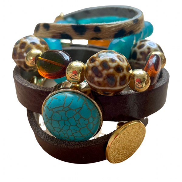 - Een armband met bruin glas en panterprint keramieken kralen gecombineerd met DQ houden kralen.